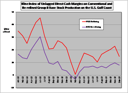 The index estimates typical cash margin contributions associated with U.S. Group II base stock production, from both VGO-based virgin base stock plants and Recovered Fuel Oil (RFO)-based re-refineries, simulating EBITDA before the deduction of corporate SG&A expenses. A rolling 24-month index will be published monthly, and is available to Kline’s clients, as well as to petroleum and lubricants industry media. The index will be updated monthly and released to Kline's clients and media contacts.